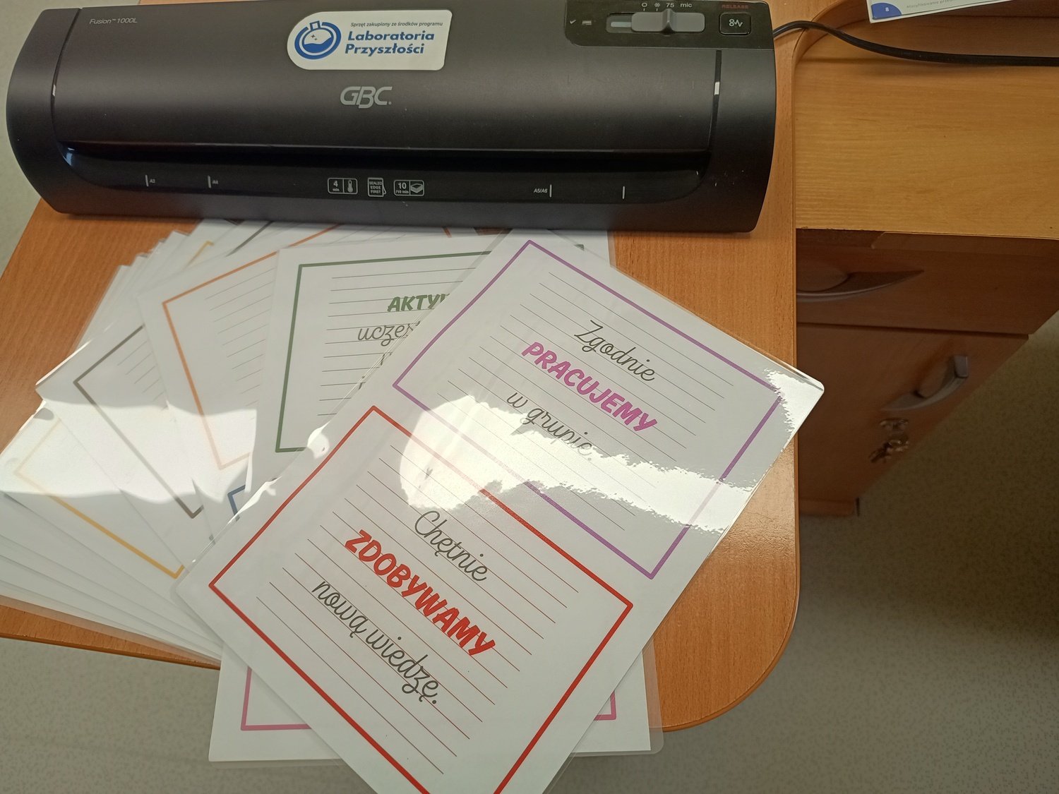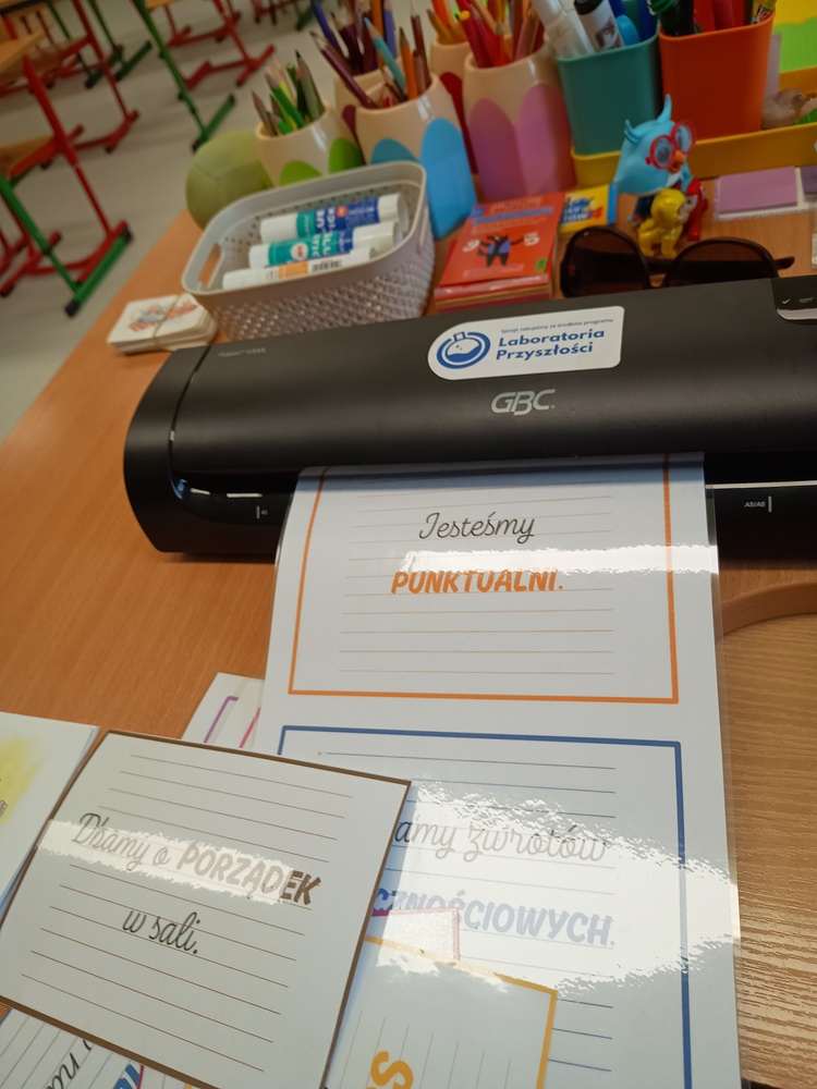 Laminarka to niezastąpiona pomoc również do ozdobienia sali. Tym razem uczniowie klasy 2b wykorzystali ją, żeby na dłużej zachować sformułowane zasady, które powinny obowiązywać każdego w naszej grupie i ozdobili nimi tablicę klasową.