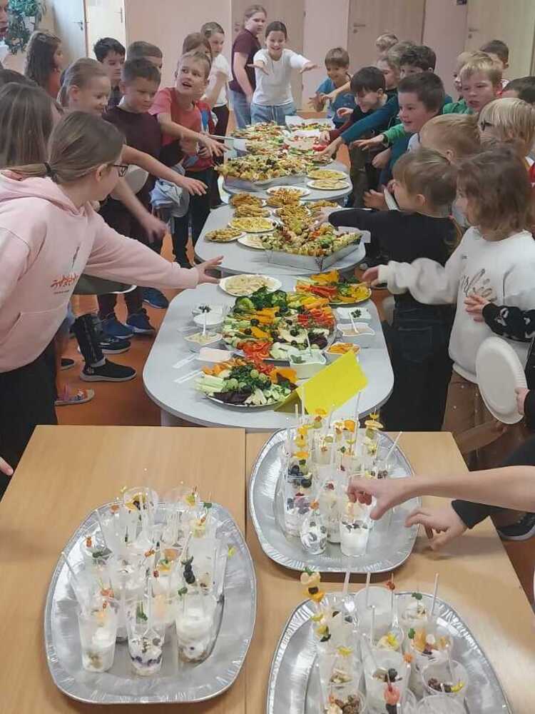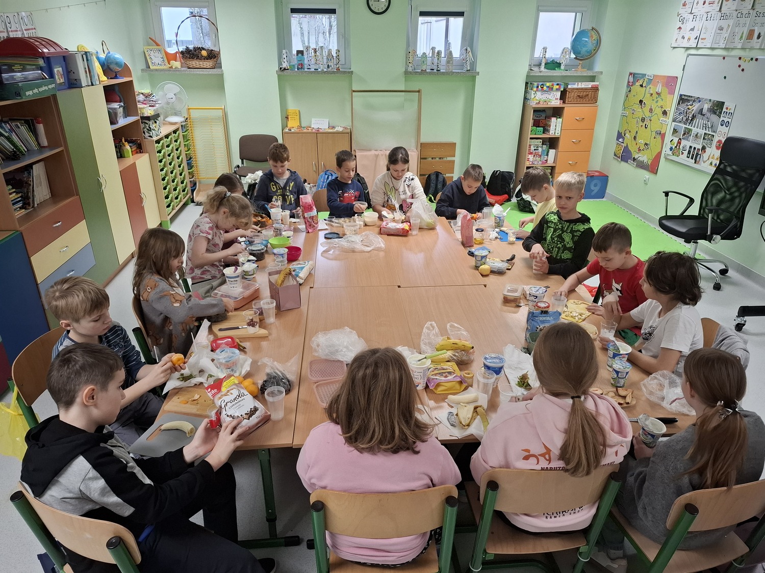 Warsztaty przebiegały w atmosferze współpracy i twórczej zabawy. Dzieci mogły nie tylko przygotować własne potrawy, ale też dowiedzieć się, jak ważną rolę w codziennym funkcjonowaniu odgrywa zdrowe odżywianie. Uczniowie z zaangażowaniem eksperymentowali ze smakami i z dumą prezentowali swoje kulinarne dzieła. Zajęcia zakończyła wspólna degustacja i rozmowa o tym, które przekąski najbardziej przypadły dzieciom do gustu. Warsztaty okazały się nie tylko pyszną przygodą, ale również praktyczną lekcją dbania o zdrowie każdego dnia.