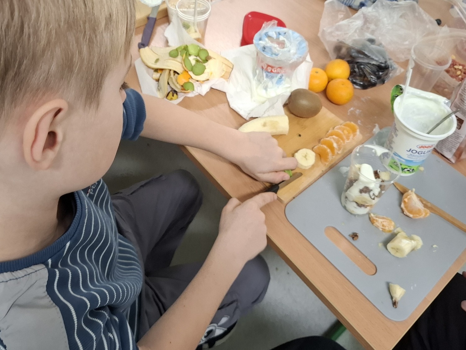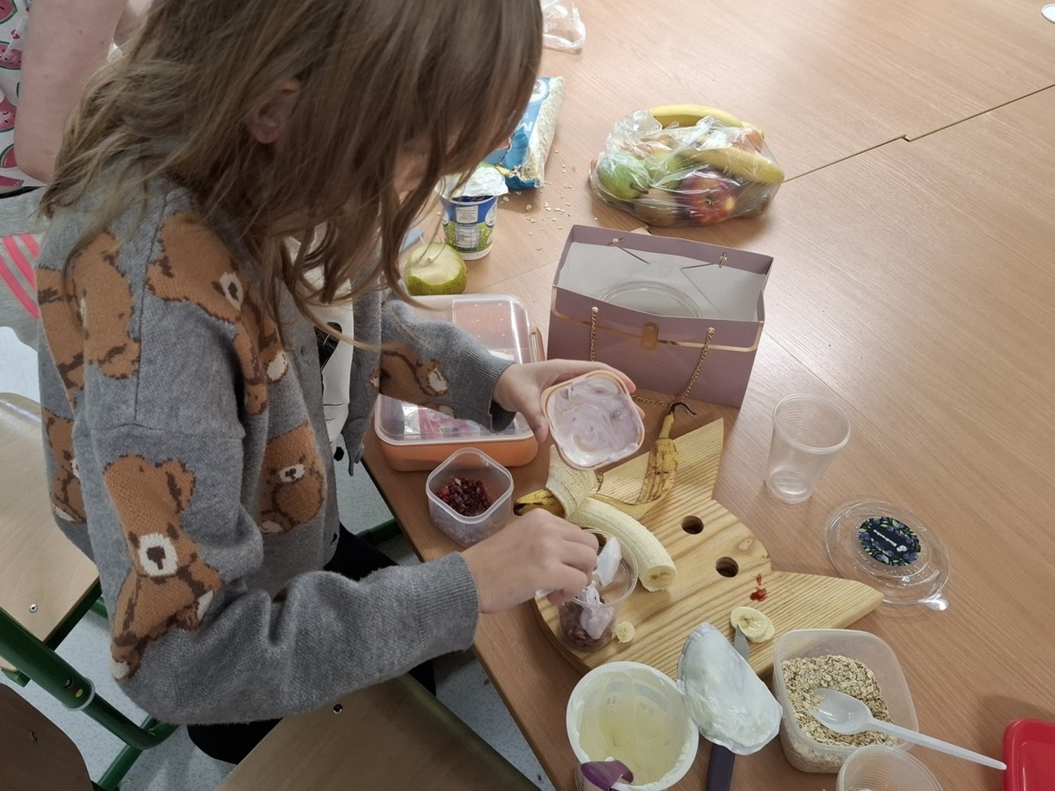 - jogurty z owocami, miodem i granolą – dzieci układały warstwowo jogurt naturalny, miód, pokrojone owoce oraz chrupiącą granolę, tworząc pyszne i pożywne desery;