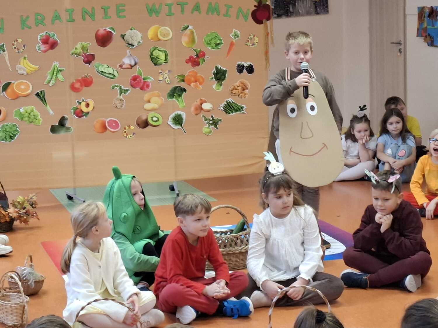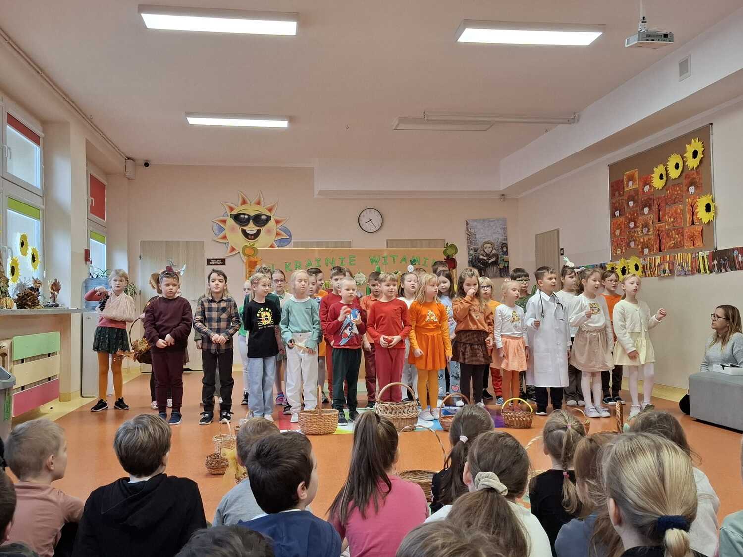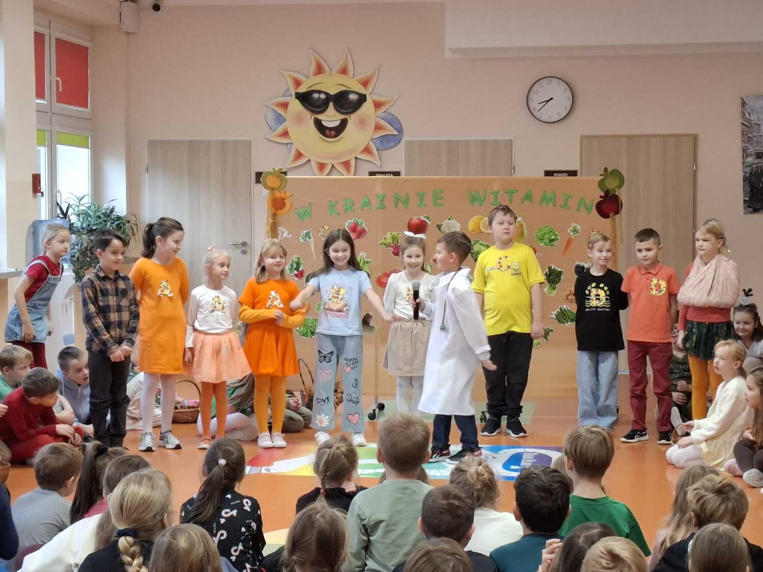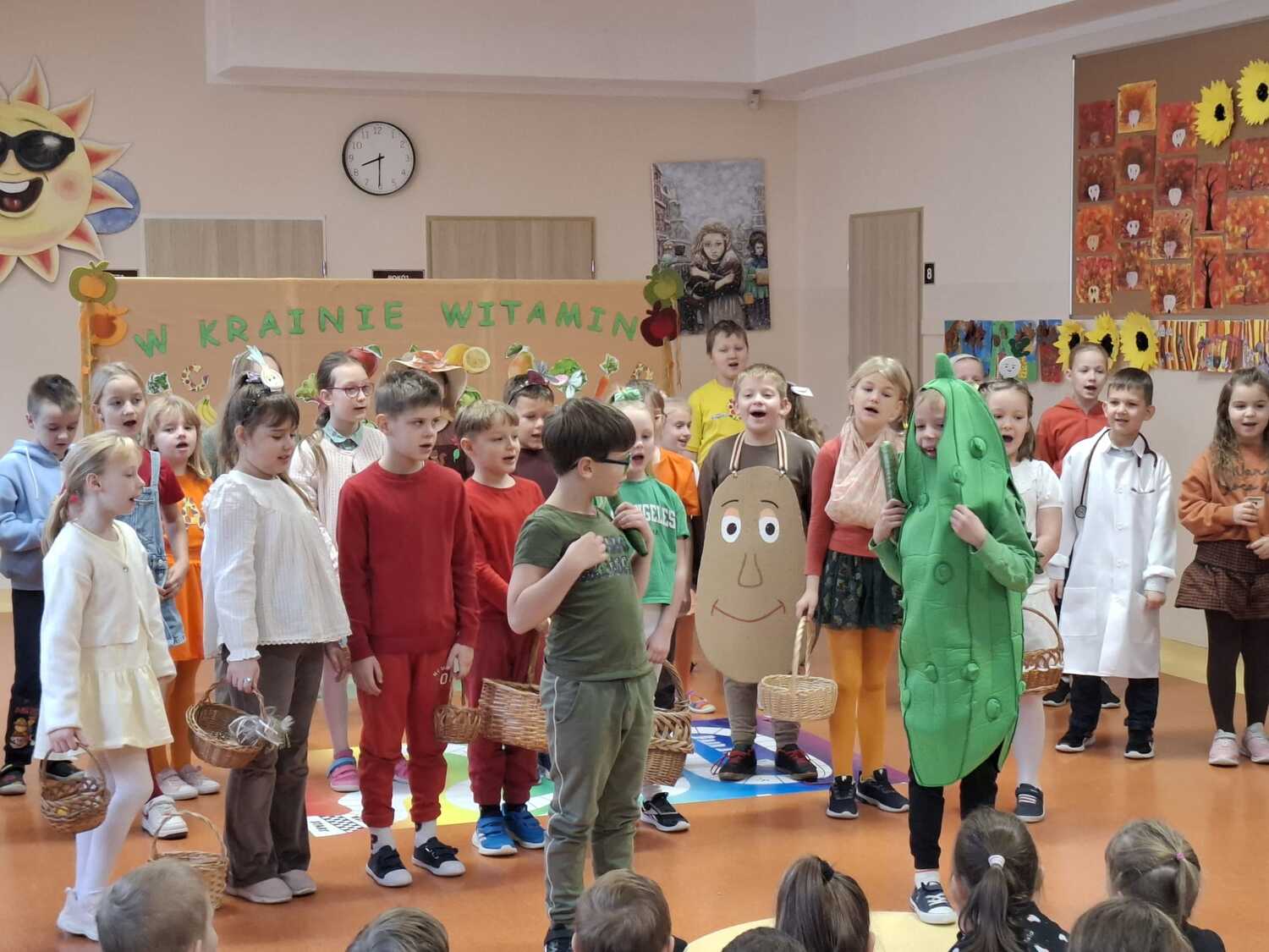 Jesień to piękna i kolorowa pora roku. Uczniowie klas drugich zaprosili koleżanki i kolegów z klas 1 i 3 do Krainy pełnej zdrowia. Razem z Panią Jesienią i dr. Zdrówko przypomnieli, że jesień to bogactwo witamin koniecznych, oprócz ruchu, do zdrowego funkcjonowania. Owoce, warzywa i kiszonki z nich uzyskiwane, to samo zdrowie. Uczniowie śpiewając piosenki, recytując wierszyki i odgrywając scenki sytuacyjne, niewątpliwie zachęcili każdego do zdrowego odżywiania. Zaś piosenki Witaminki i Ogórek rozbrzmiewały na korytarzach szkoły jeszcze długo po spektaklu.