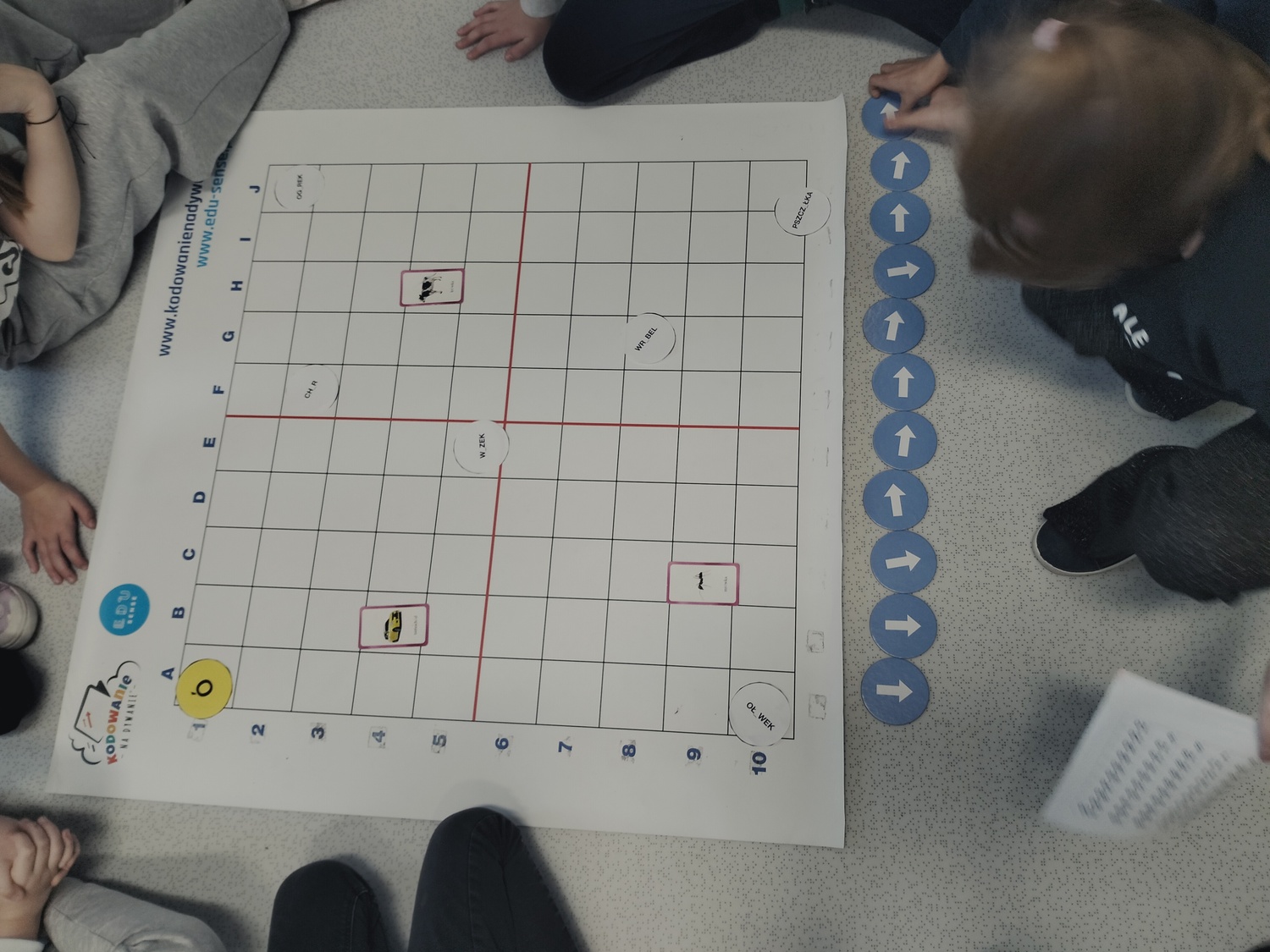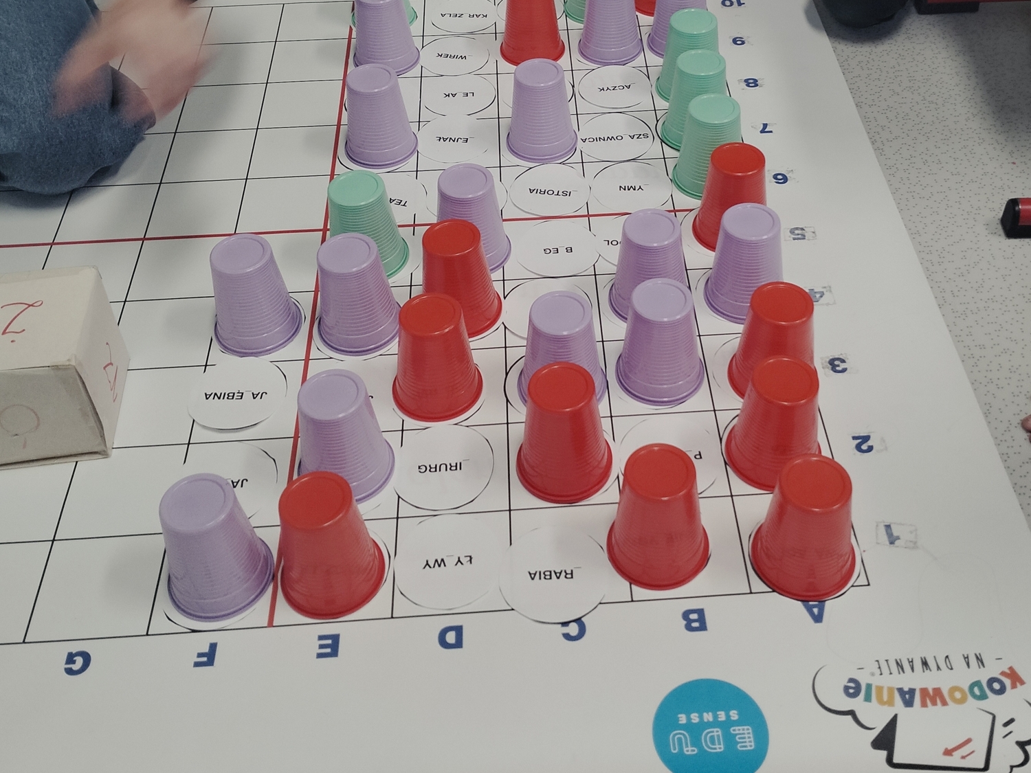 Mata do kodowania oraz kolorowe kubeczki świetnie pomagają przy utrwalaniu zasad ortograficznych. Uczniowie klasy 2a kodują drogę w taki sposób, aby pozbierać wszystkie wyrazy z rz i ó wymiennym. Natomiast na zajęciach korekcyjno-kompensacyjnych uczniowie klasy 5 utrwalają pisownię wyrazów z rz, ż, ch, h, u i ó. Rywalizują w zdobyciu jak największej liczby kubeczków położonych na wyrazie, którego pisownia jest zgodna z regułą ortograficzną, którą wylosowali.