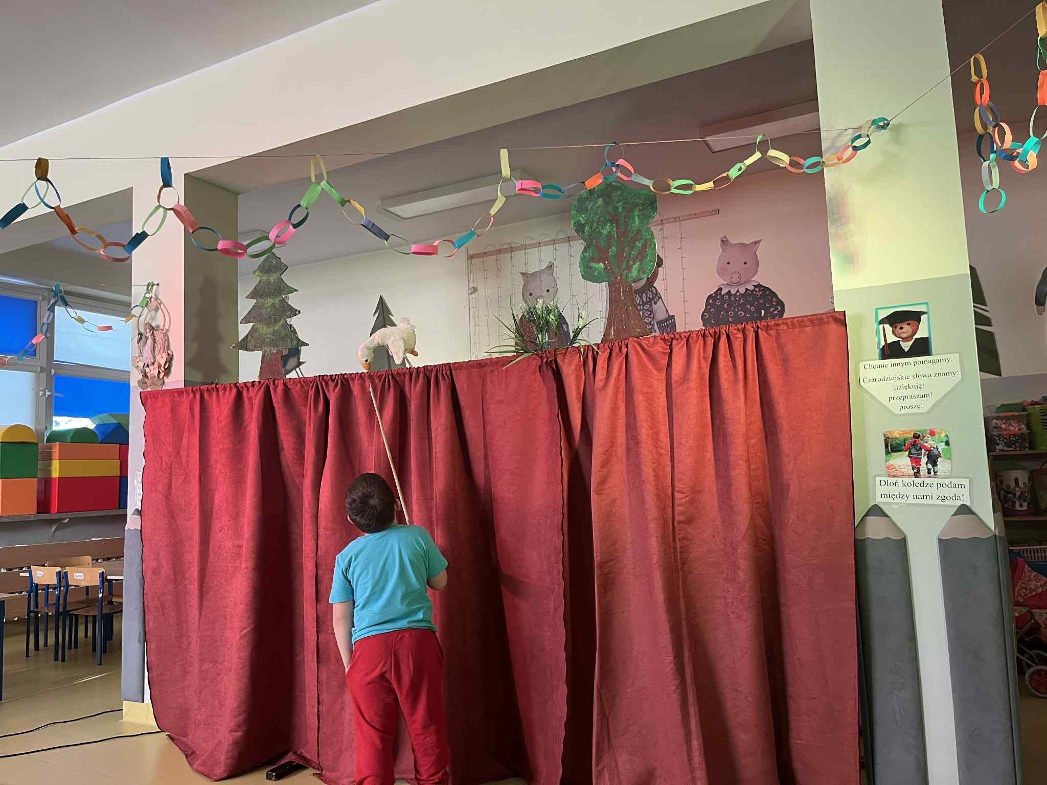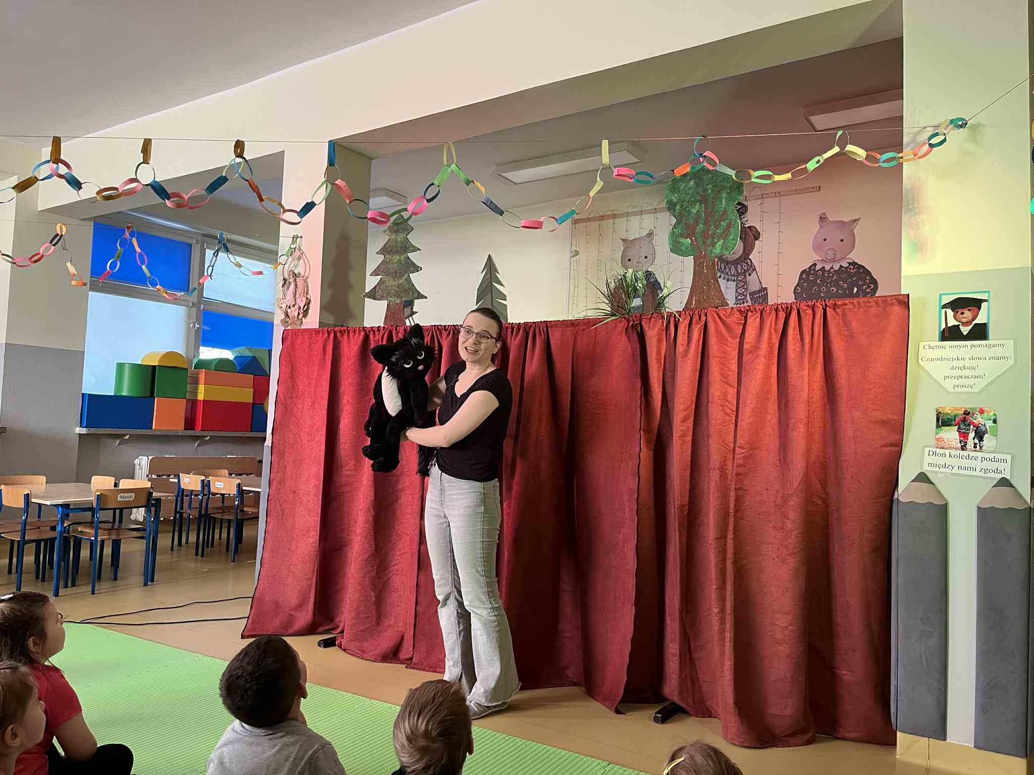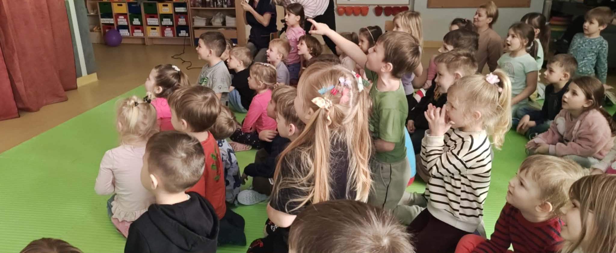 Mali widzowie z ogromnym zainteresowaniem śledzili losy sympatycznego Jeżyka, który uczy, jak radzić sobie z emocjami, prosić o pomoc i wspierać innych w trudnych chwilach. Przedstawienie było pełne ruchu, muzyki i humoru, a aktorzy wciągnęli dzieci do wspólnej zabawy, dzięki czemu najmłodsi mogli aktywnie uczestniczyć w historii. Teatrzyk nie tylko dostarczył wielu pozytywnych emocji, ale także rozwijał wyobraźnię, empatię i umiejętność współpracy. To było piękne, wartościowe spotkanie z teatrem, które na długo pozostanie w pamięci naszych przedszkolaków. Dziękujemy aktorom z "Teatru Pacuś".