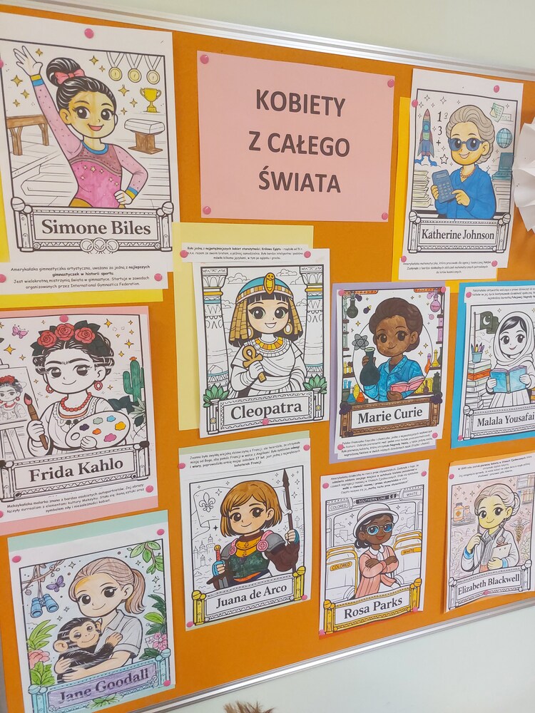 W świetlicy, z okazji Dnia Kobiet, odbyły się zajęcia poświęcone sławnym kobietom oraz ich zawodom. Uczniowie dowiedzieli się, że dzięki pasji, pracy i wytrwałości można osiągnąć wiele sukcesów. Dzieci przygotowały portrety kobiet, które zdobią tablicę w świetlicy.