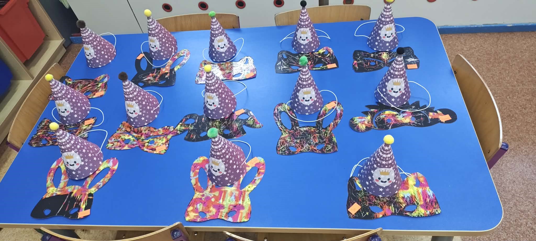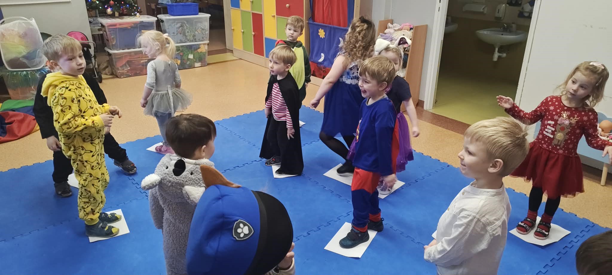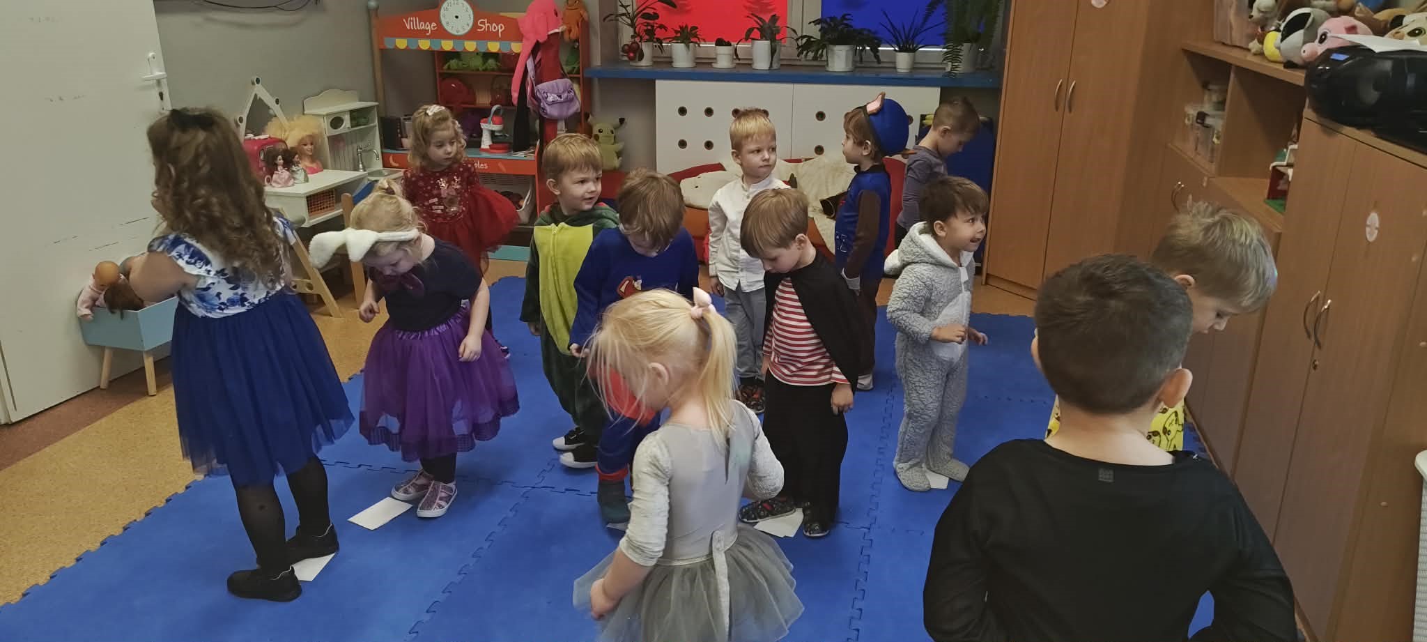 Przedszkolaki pojawiły się w przepięknych, pomysłowych strojach – od księżniczek i superbohaterów, po zwierzątka, postacie z bajek i małych odkrywców. Każdy kostium był wyjątkowy i dodawał balowi niezwykłego uroku. Podczas zabawy dzieci brały udział w tańcach, konkursach ruchowych i wspólnych pląsach. Nie zabrakło również zabaw integracyjnych, które wzmacniały współpracę i budowały pozytywną atmosferę w grupie. Smerfy bawiły się z ogromnym zaangażowaniem, a ich energia i uśmiechy sprawiły, że bal stał się prawdziwym świętem radości.