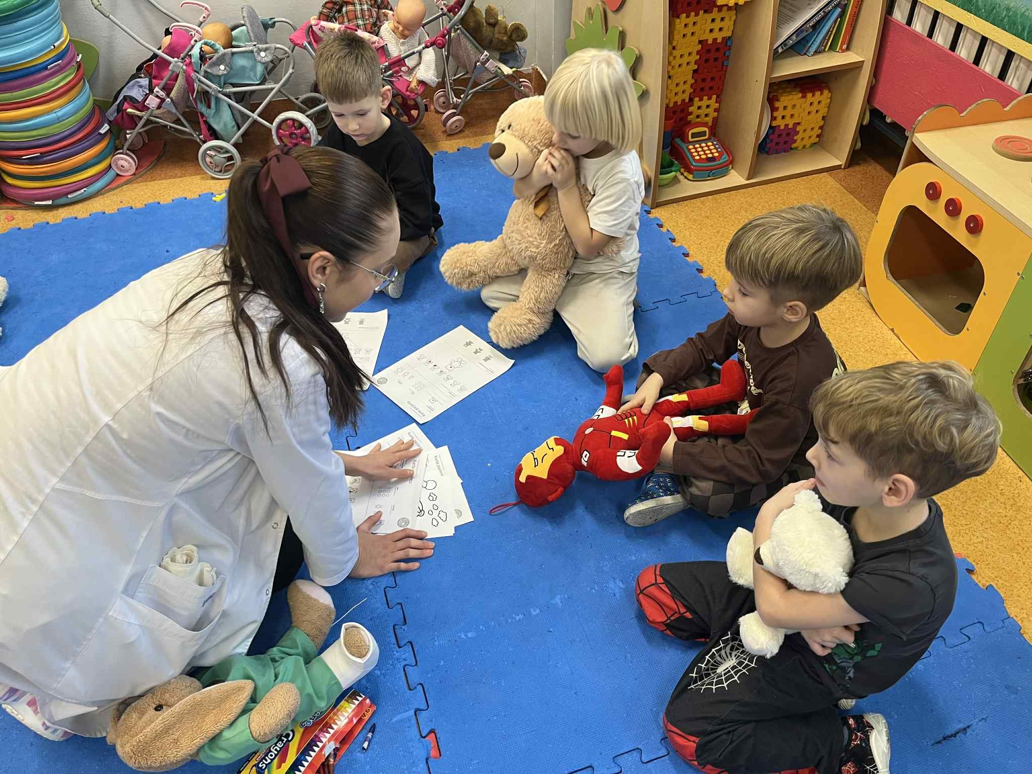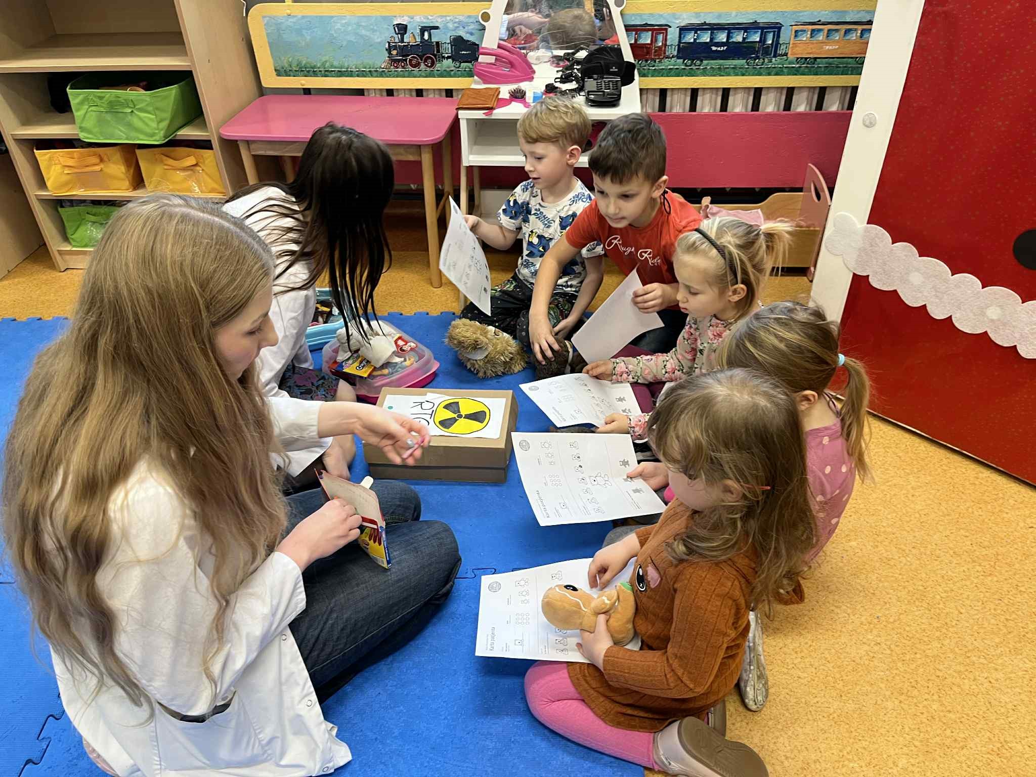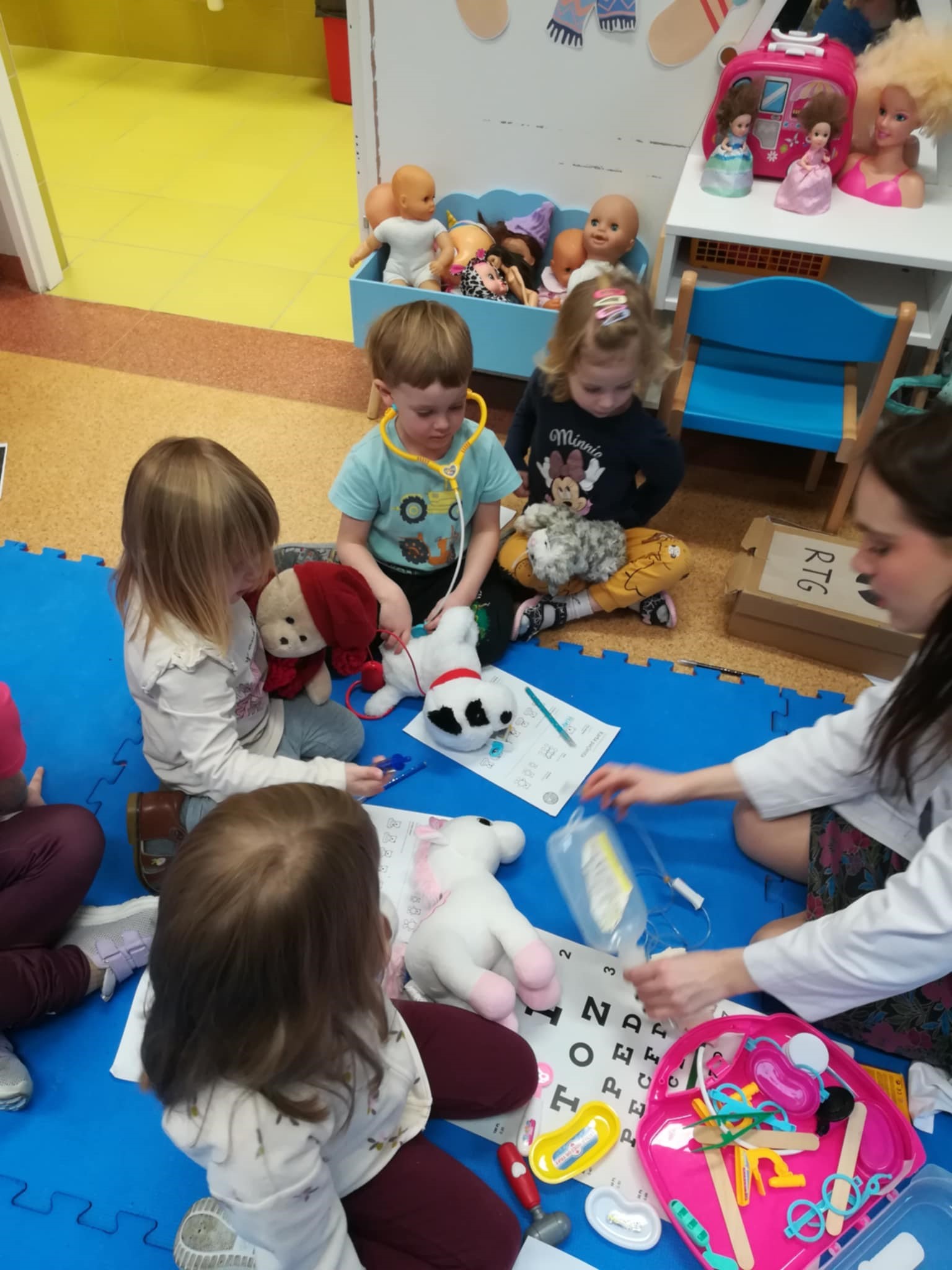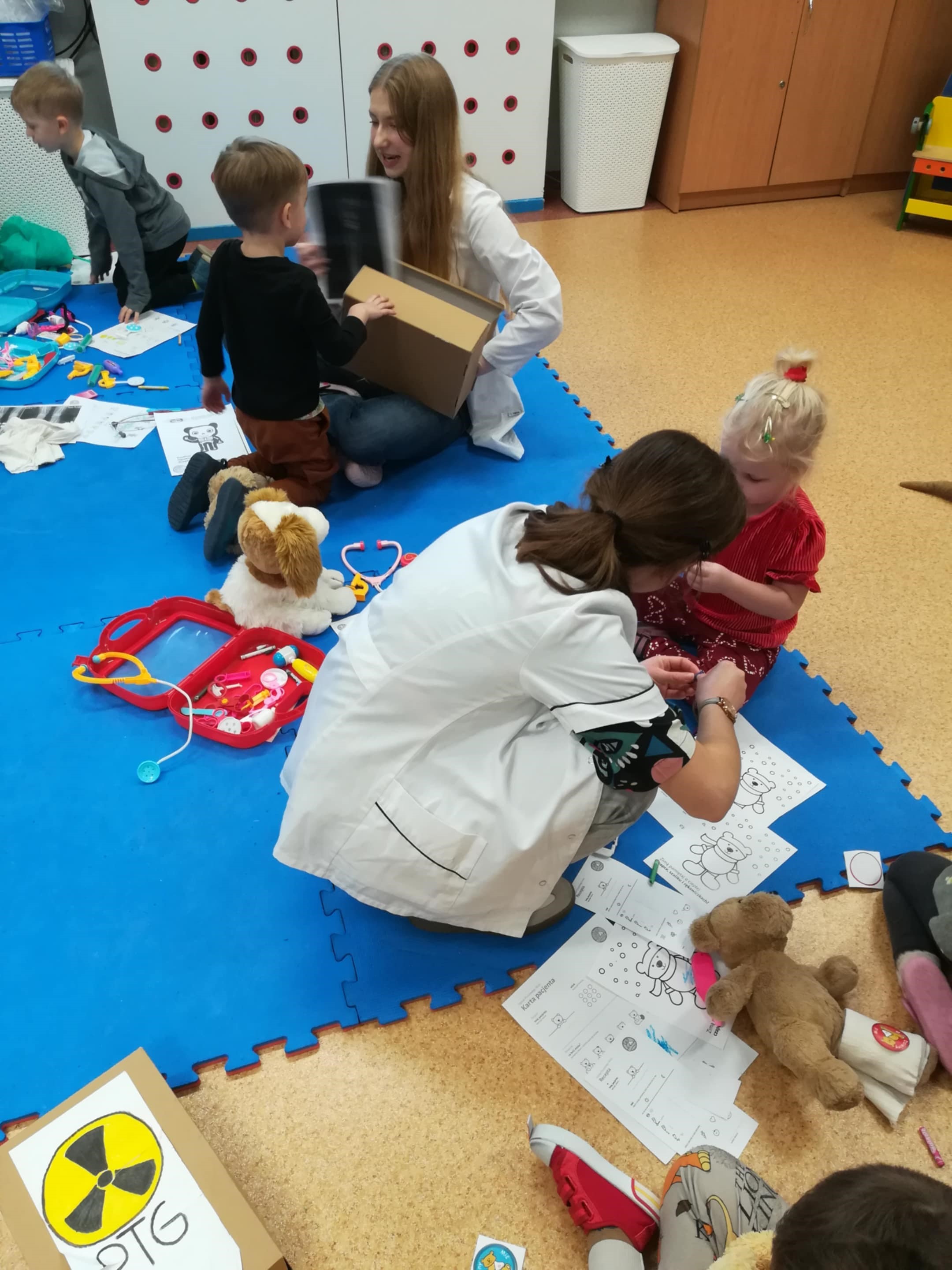 Dzieci przyniosły do przedszkola swoje ulubione pluszowe misie i inne maskotki, które „zachorowały” i wymagały pomocy. Podczas zabawy dzieci wcielały się w rolę lekarzy, pielęgniarek i opiekunów, badały misie, zakładały opatrunki, wypisywały recepty, korzystały z przygotowanych stanowisk: gabinet lekarski, apteka, sala zabiegowa, poczekalnia, poznawały podstawowe narzędzia medyczne i ich zastosowanie w bezpieczny, zabawowy sposób, rozmawiały o emocjach związanych z chorobą, wizytą u lekarza i troską o innych. Dzieci z zaangażowaniem uczestniczyły w zabawie, wykazując troskę, odpowiedzialność i chęć niesienia pomocy.