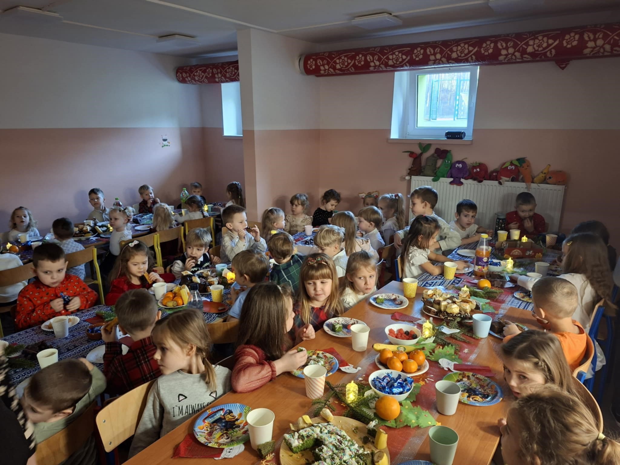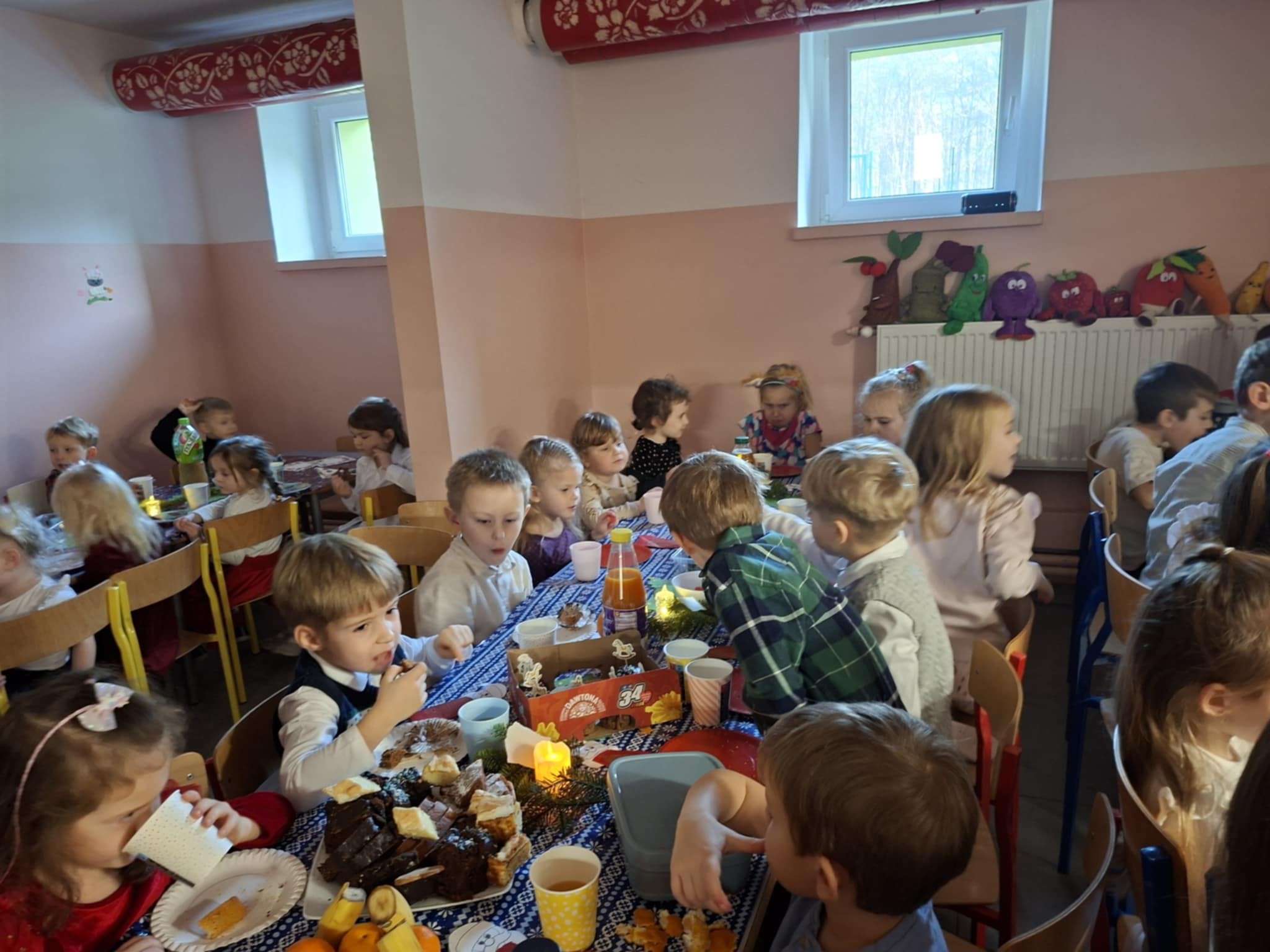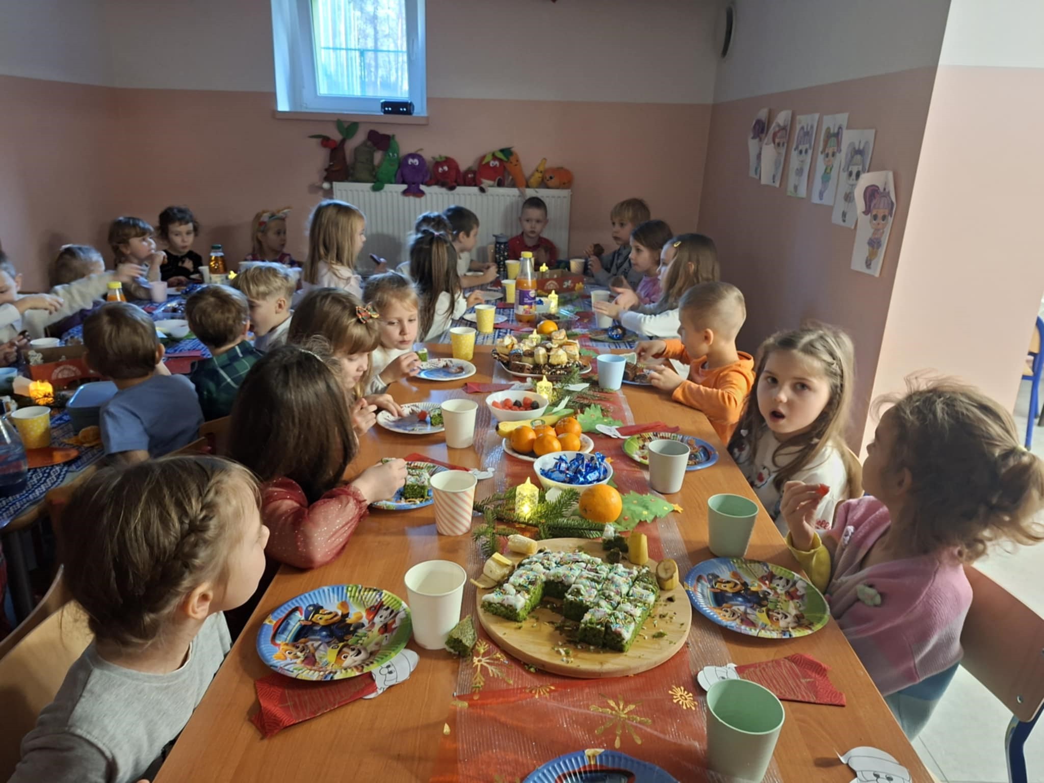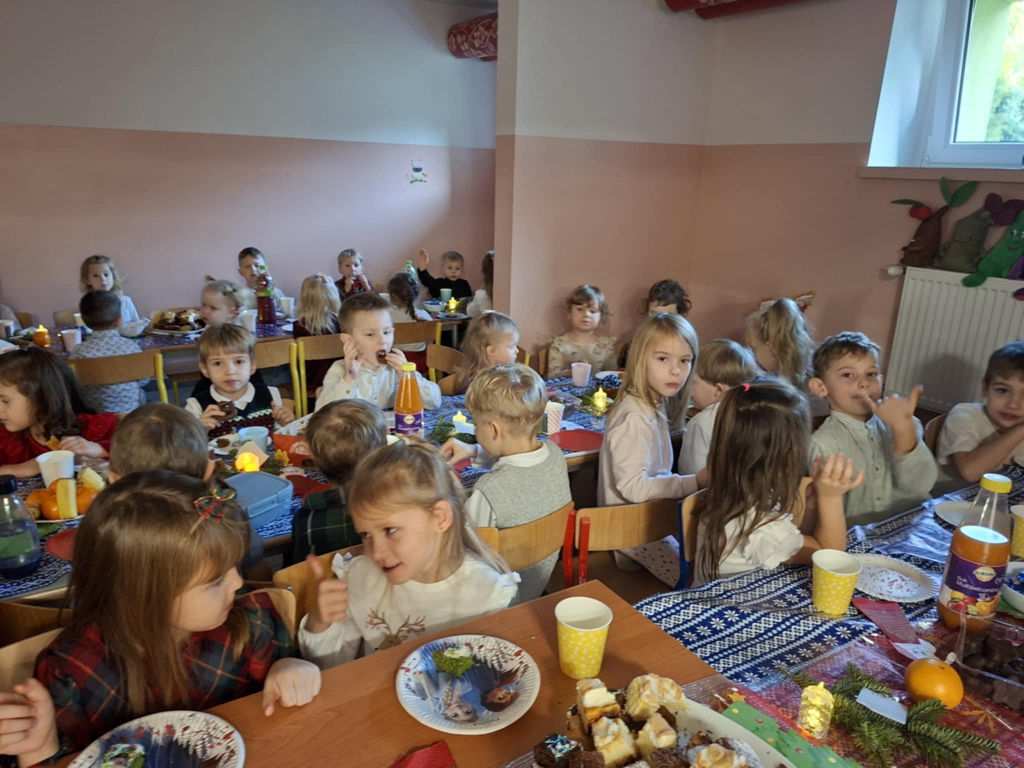 Dzieci zasiadły do wspólnego stołu, dzieląc się opłatkiem, składając sobie życzenia i kosztując wigilijnych potraw przygotowanych specjalnie na tę okazję. Wspólne kolędowanie, rozmowy oraz świąteczne melodie w tle sprawiły, że w całej placówce panował wyjątkowy, rodzinny nastrój. Spotkanie było nie tylko celebracją tradycji, ale także momentem pełnym radości, wzruszeń i wzajemnej życzliwości. Dzieci z entuzjazmem uczestniczyły w wydarzeniu, a magia świąt była obecna w każdym uśmiechu i geście.