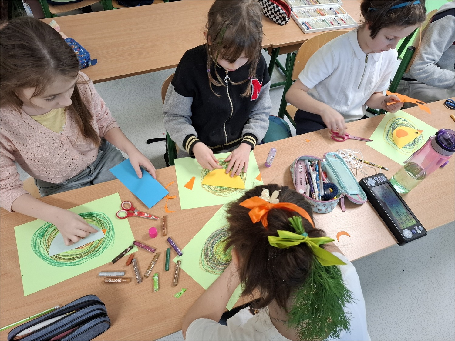 Tego dnia uczniowie wykonywali również wiosenne prace plastyczne. Powstały kolorowe rysunki, kwiaty z papieru oraz różnorodne dekoracje nawiązujące do budzącej się do życia przyrody. Dzieci wykazały się dużą kreatywnością i pomysłowością, a ich prace ozdobiły sale lekcyjne.