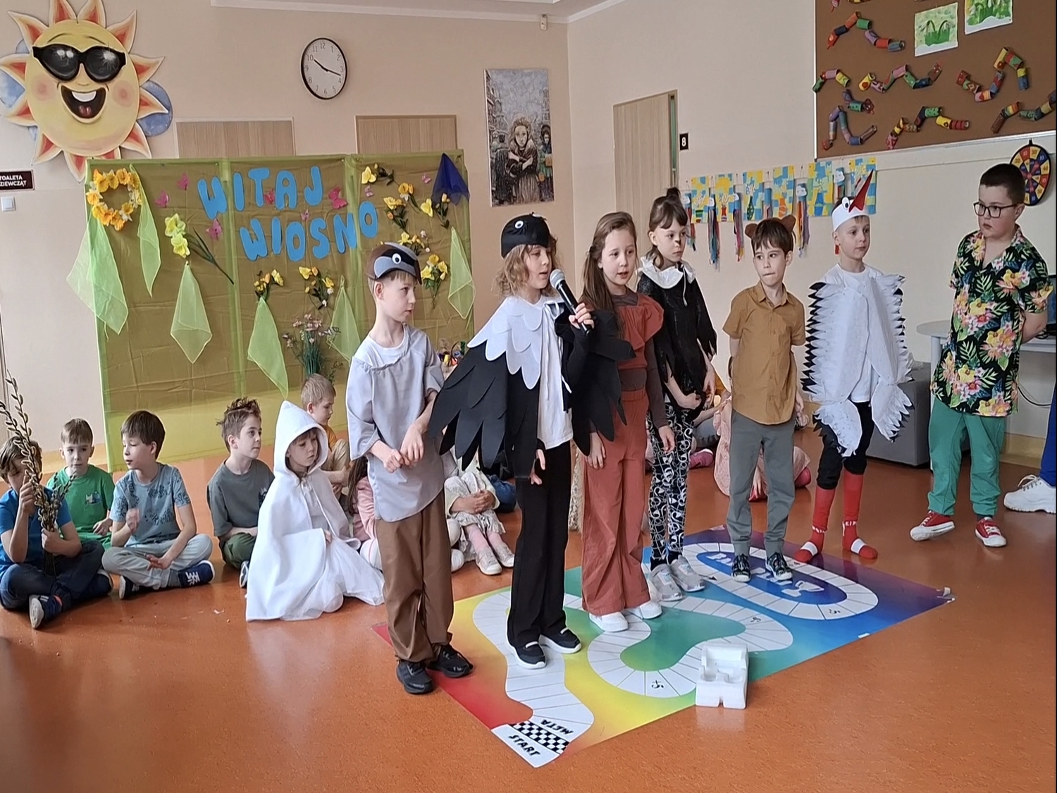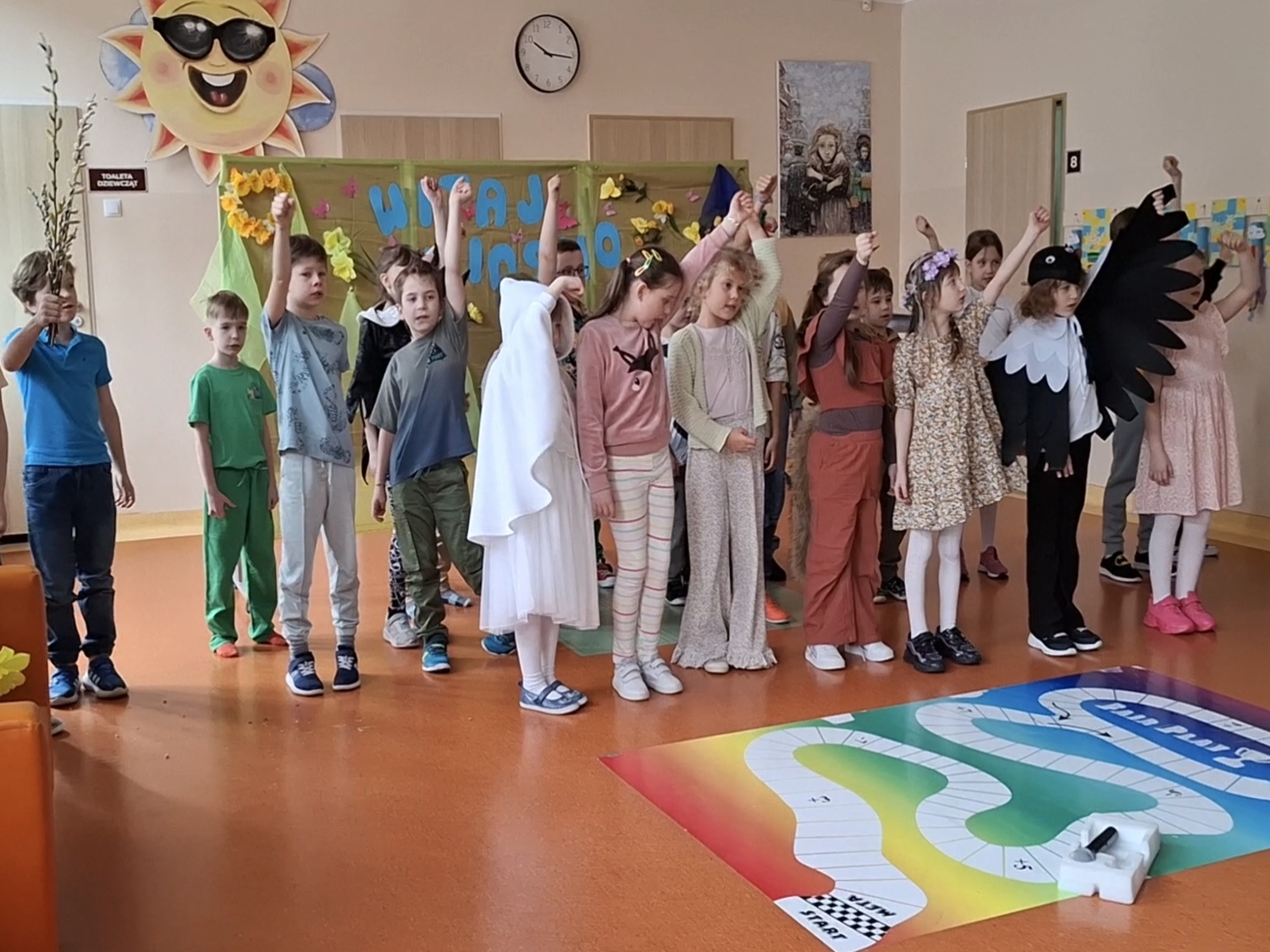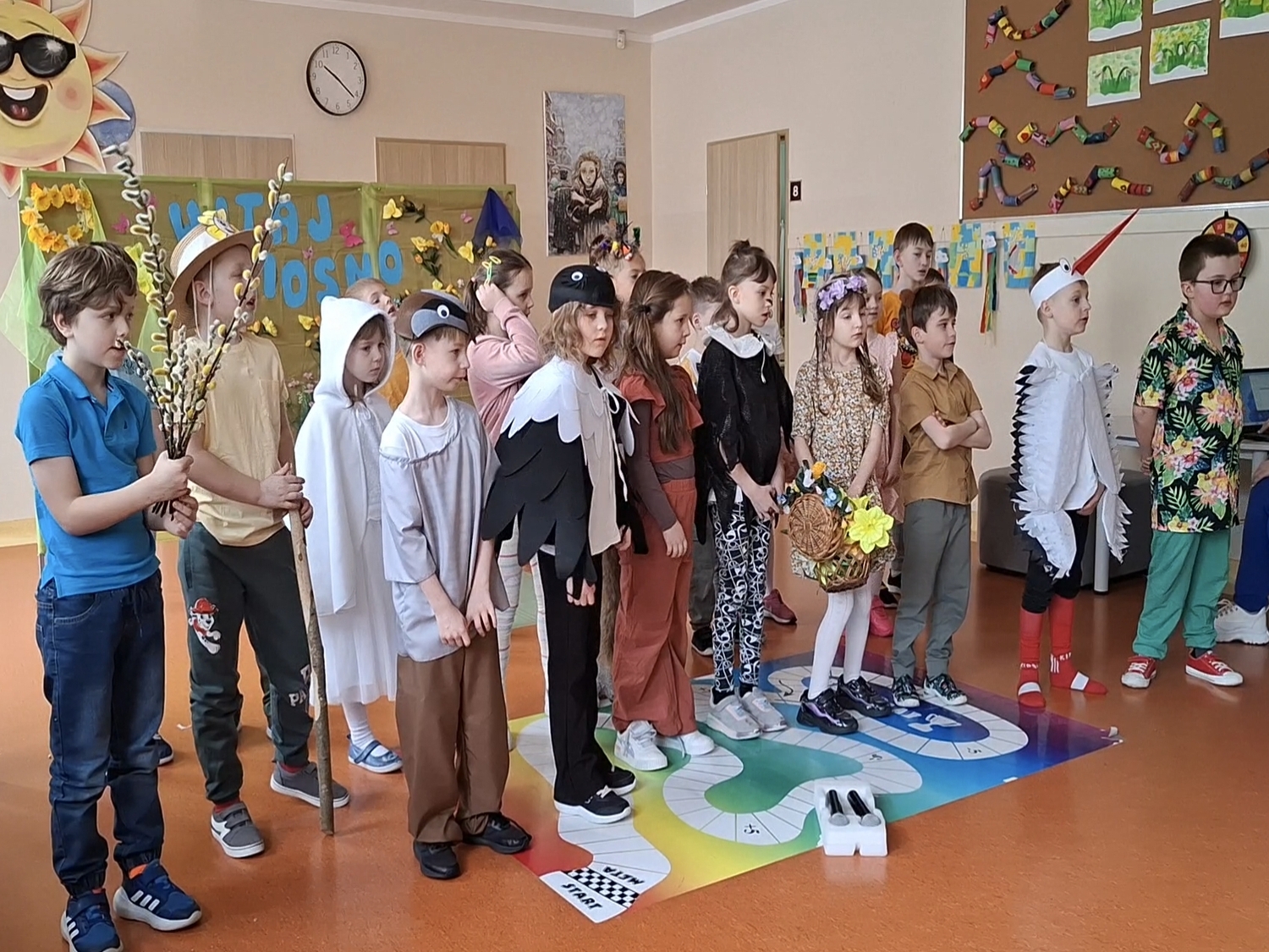 Witanie wiosny przez klasy 1–3 było radosnym i kolorowym wydarzeniem. Uroczystość rozpoczęła się od obejrzenia wiosennego przedstawienia przygotowanego przez uczniów klas pierwszych. Dzieci z dużym zaangażowaniem zaprezentowały inscenizację, w której pojawiły się postacie symbolizujące odchodzącą zimę oraz nadchodzącą wiosnę. Nie zabrakło wierszyków, piosenek i tańców, które zostały nagrodzone gromkimi brawami.