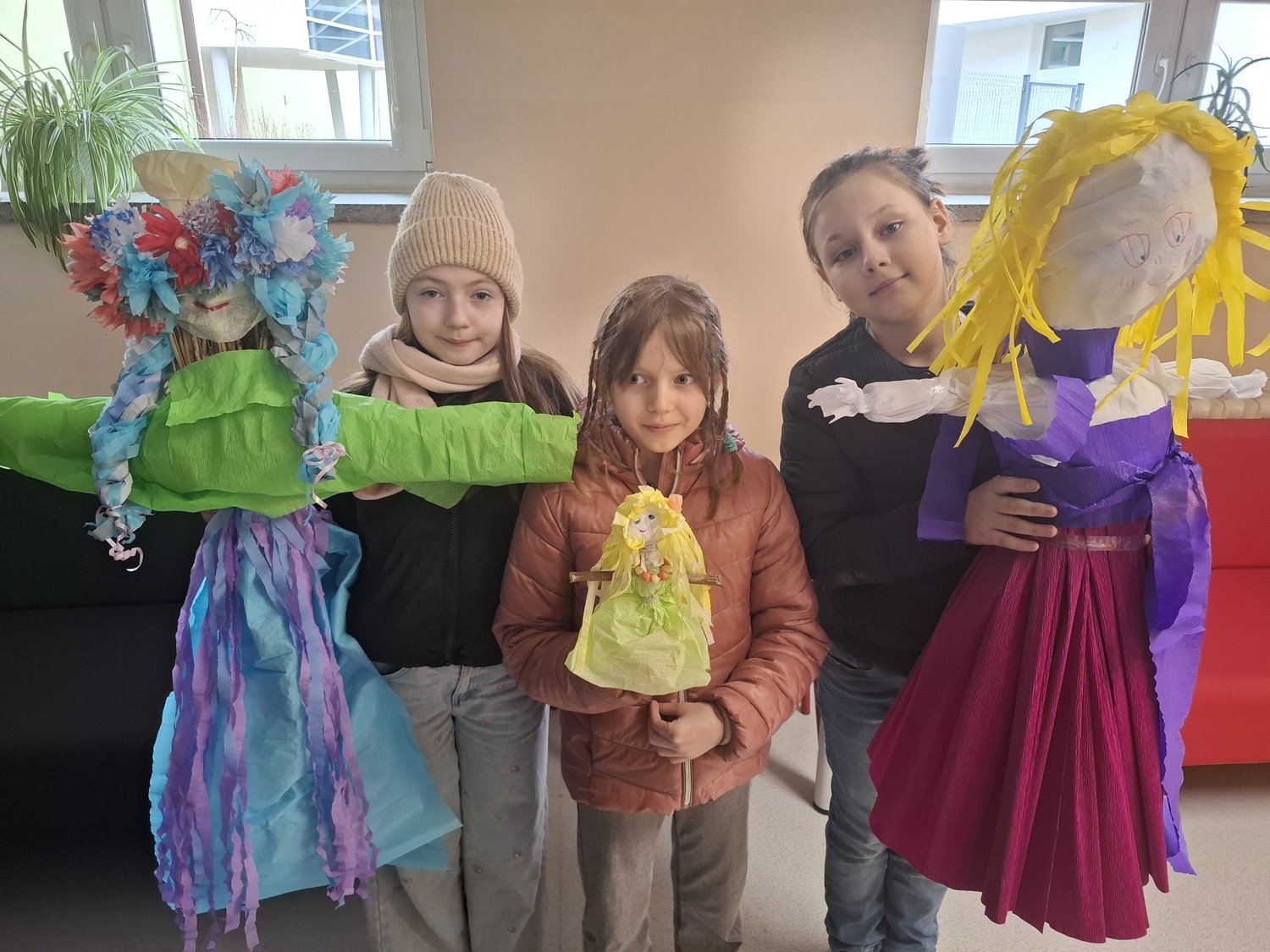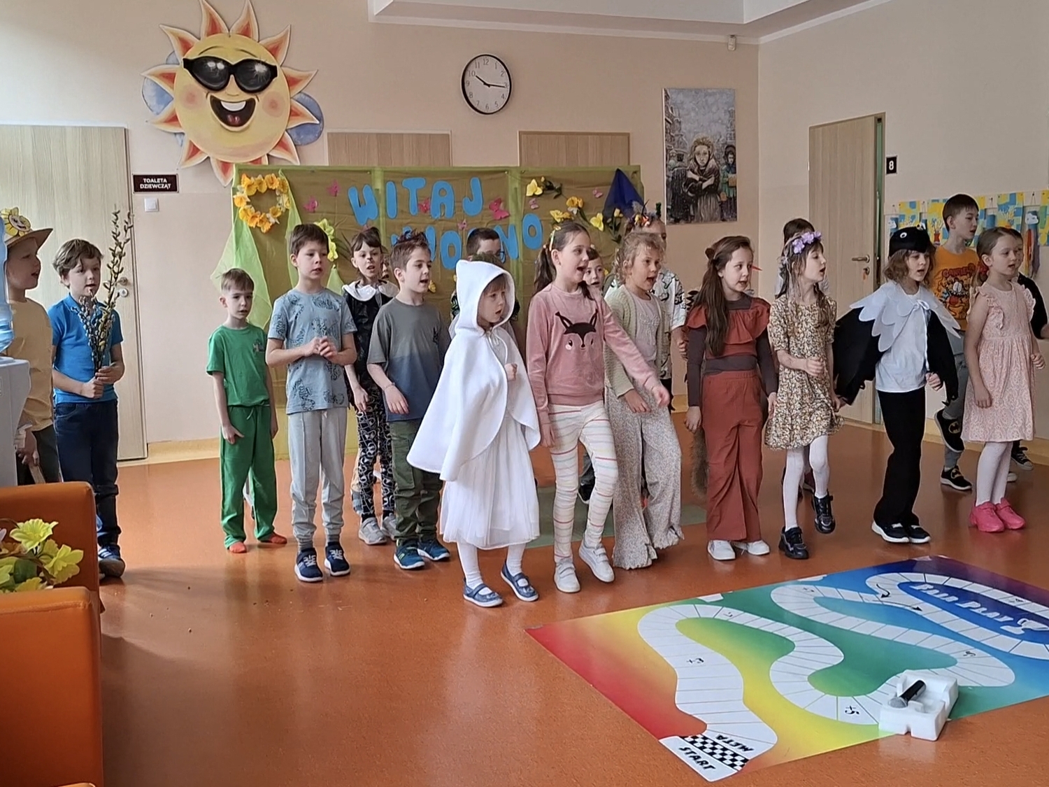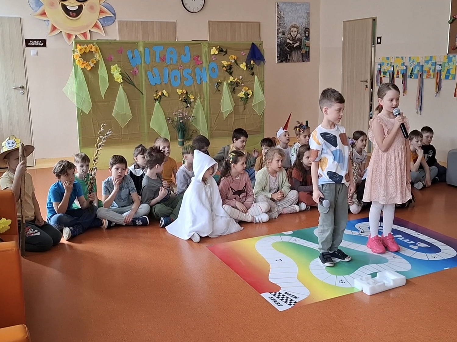 Witanie wiosny przez klasy 1–3 było radosnym i kolorowym wydarzeniem. Uroczystość rozpoczęła się od obejrzenia wiosennego przedstawienia przygotowanego przez uczniów klas pierwszych. Dzieci z dużym zaangażowaniem zaprezentowały inscenizację, w której pojawiły się postacie symbolizujące odchodzącą zimę oraz nadchodzącą wiosnę. Nie zabrakło wierszyków, piosenek i tańców, które zostały nagrodzone gromkimi brawami.