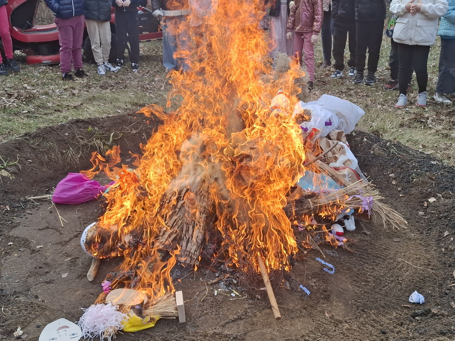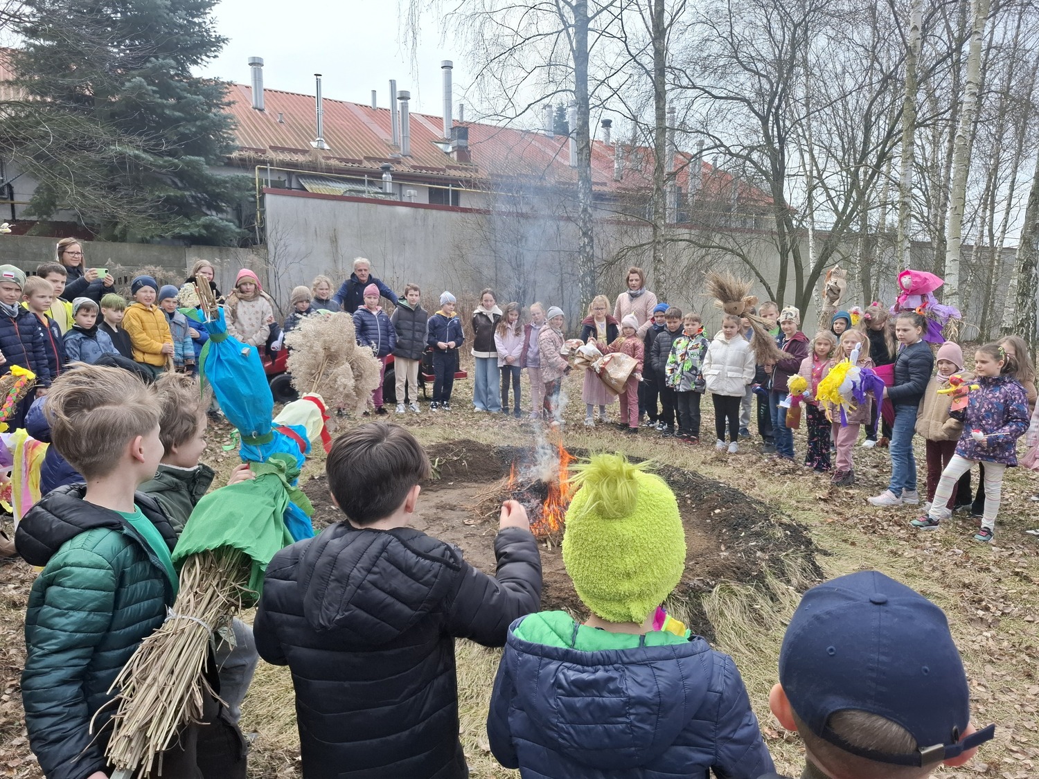 Po części artystycznej uczniowie wszystkich klas udali się na wspólne pożegnanie zimy poprzez tradycyjny zwyczaj palenia marzanny. Kukły zostały wcześniej starannie przygotowane przez dzieci w domu, co dodatkowo podkreśliło ich zaangażowanie i kreatywność. W atmosferze radości i śmiechu uczniowie obserwowali, jak symbol zimy znika, robiąc miejsce dla cieplejszych dni.