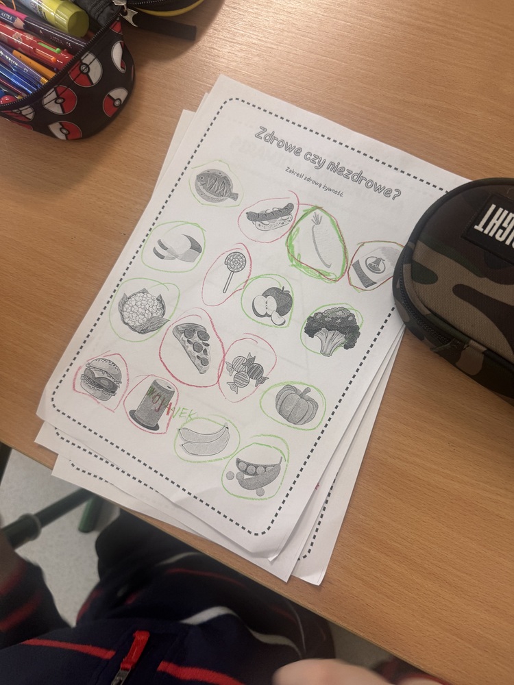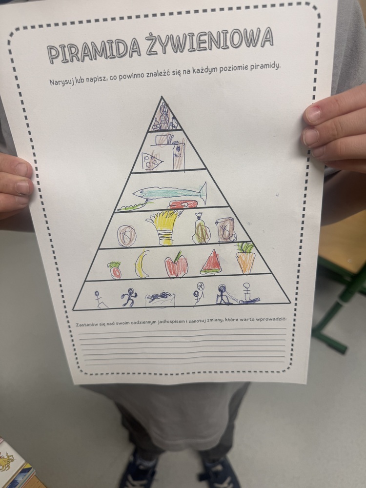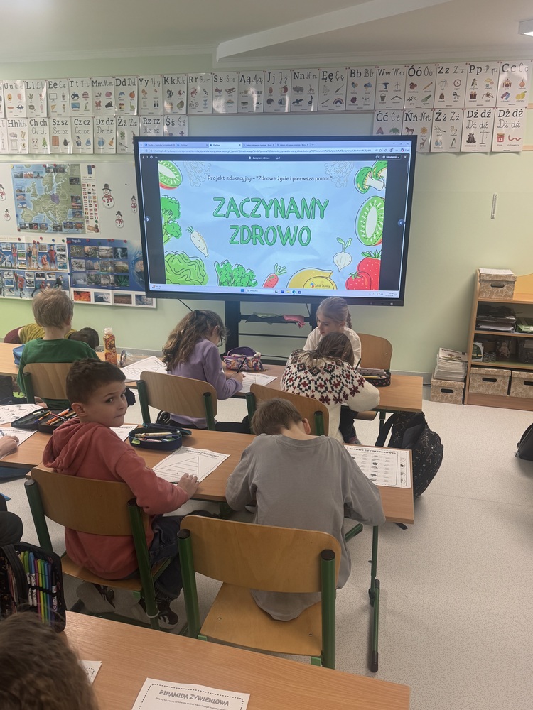 Podczas spotkania dzieci dowiedziały się, czym jest piramida zdrowia oraz jak komponować zdrowe i wartościowe posiłki. Szczególną uwagę poświęcono przygotowywaniu szkolnych śniadaniówek, które powinny być smaczne, kolorowe i bogate w witaminy. Zajęcia były ciekawą i praktyczną lekcją dbania o zdrowie na co dzień. Dodatkowo uczniowie w listopadzie brali udział w szkoleniu z pierwszej pomocy, prowadzonym przez Pana Mariusza Kotelnickiego.